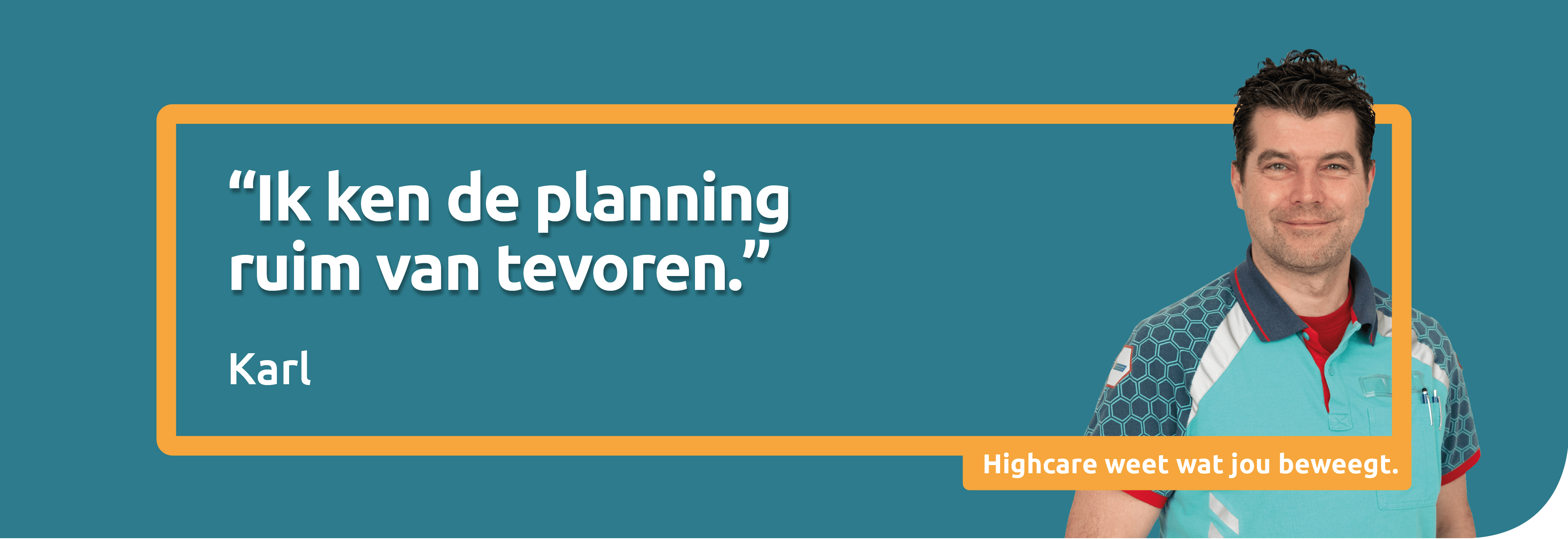 Karl is meer dan tevreden met zijn vast dienstverband bij Highcare. Hij heeft zelf zitting genomen in de OR (bij de zorgbemiddelaar). Er is dan ook geregeld contact met de collega's op de planning als met andere zorgverleners die werken via Highcare. Ook wordt er zo nu en dan de tijd genomen voor een teamuitje. Zo werd nadat zijn periode in Rotterdam erop zat zelfs een afscheidsborrel voor hem georganiseerd door de Rotterdamse collega’s.